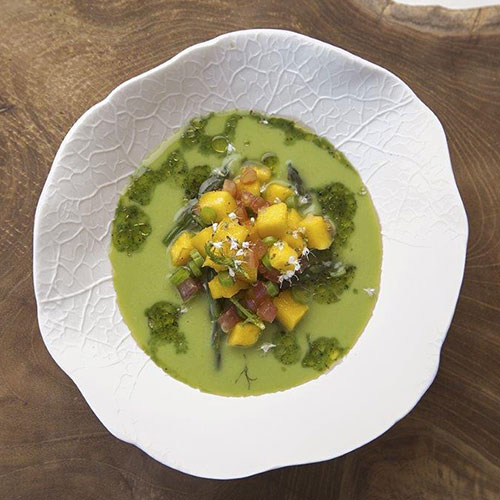 Cubed mango and asparagus soup