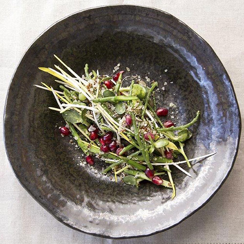 Pomegranate, asparagus and corn shoot salad