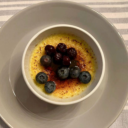 Buchu creme brulee and preserved balsamic berries