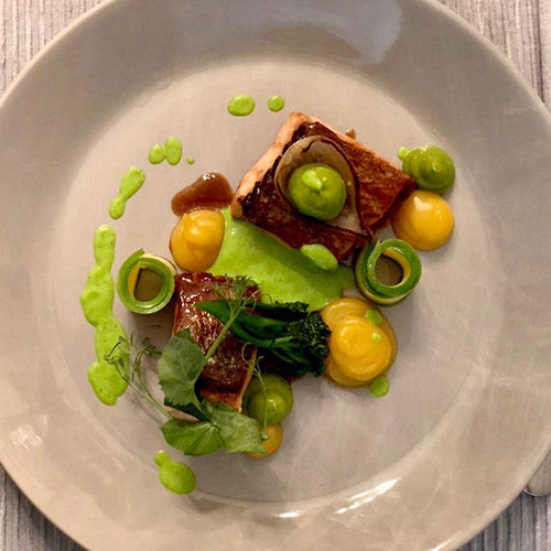 Char Sui marinated salmon, peas and orange